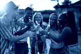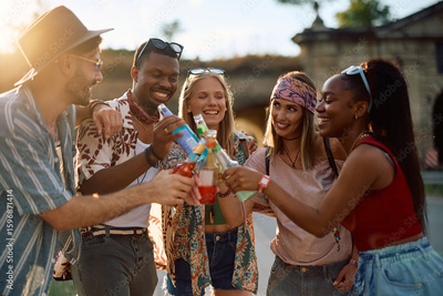 Happy friends having fun and toasting while attending summer music festival.