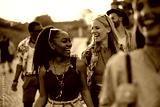 Cheerful female friends enjoying in summer while attending open air music festival.