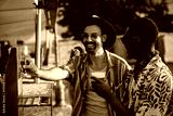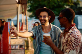 Happy paying contactless while buying drinks with friend at open air music concert in summer.