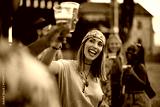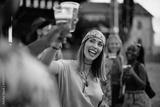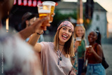 Happy woman toasting with her friend while drinking beer at summer music festival.
