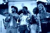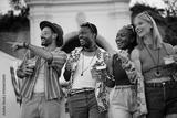 Young happy friends having fun while going to summer music festival.