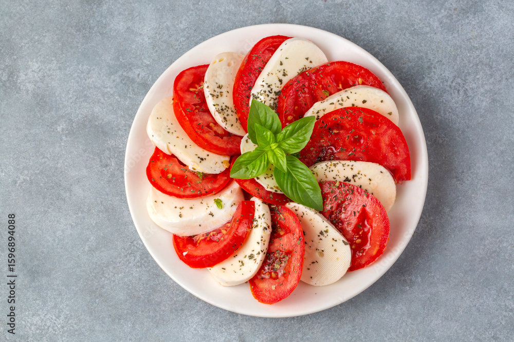 Italian caprese salad with sliced tomatoes, mozzarella, basil, olive oil