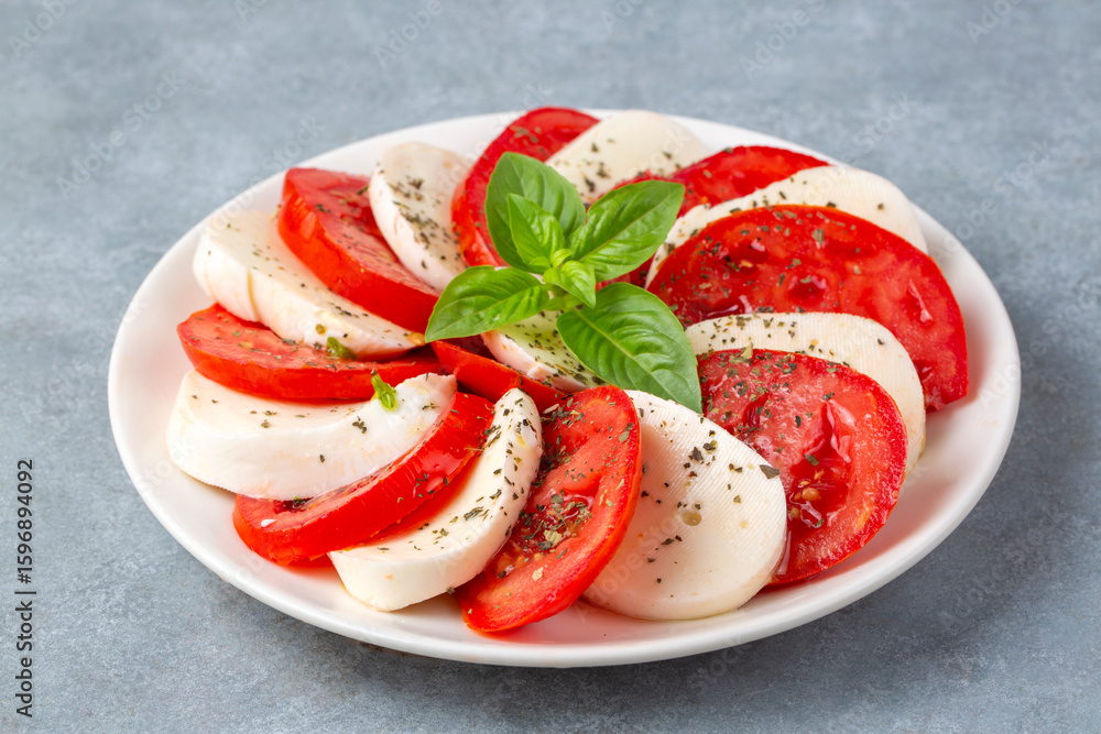 Italian caprese salad with sliced tomatoes, mozzarella, basil, olive oil