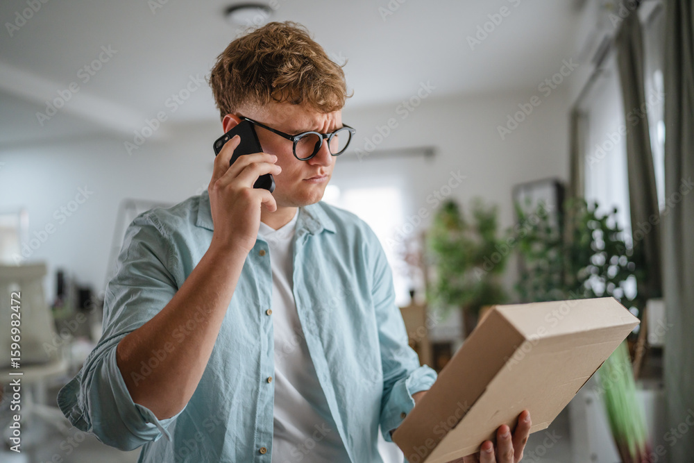 A concerned man looks at his post package and talk on mobile phone