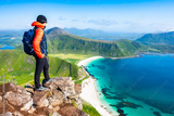 Female hiker enjoying spectacular view of Haukland beach with sea and mountains from Mannen peak, Lofoten Islands, Norway