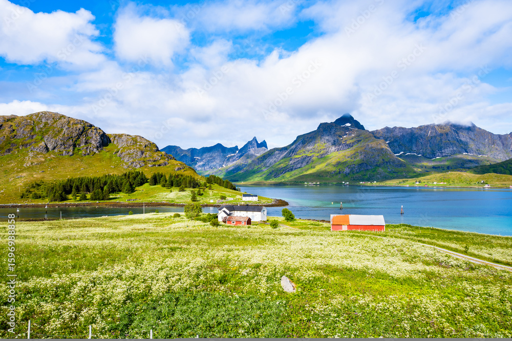Farm houses on green meadow near Fredvang village on Moskenesoy island in summer, Lofoten Islands, Norway