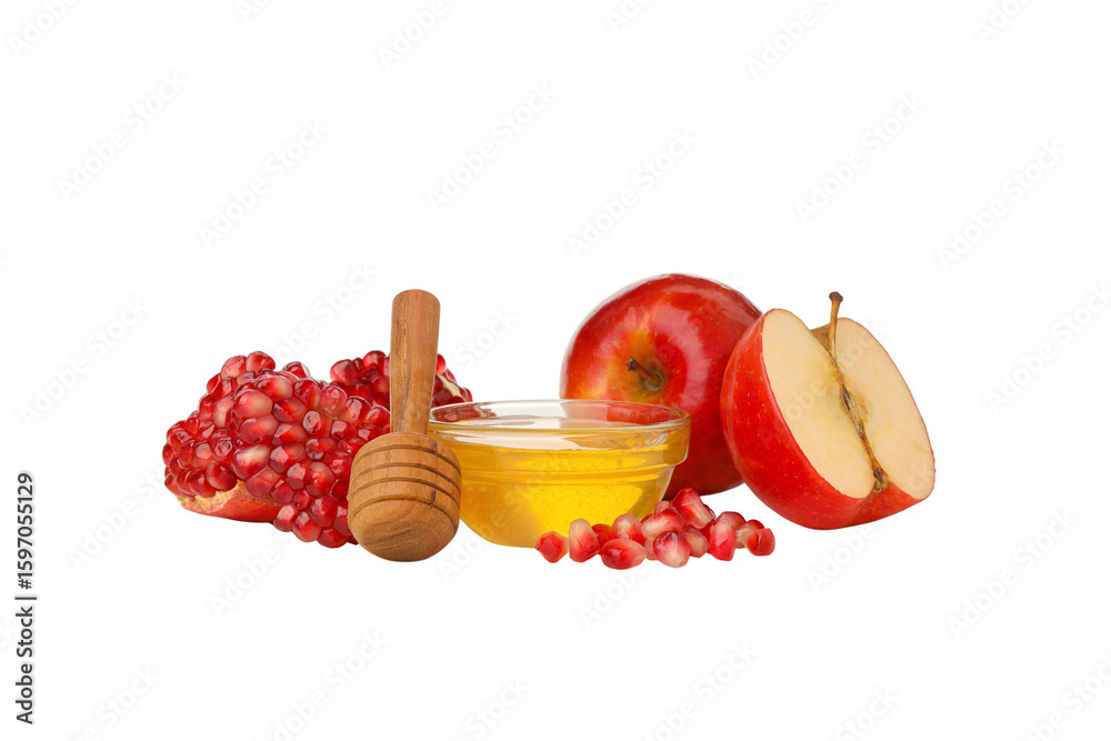 Apple slices, honey, and pomegranate, isolated on white, PNG