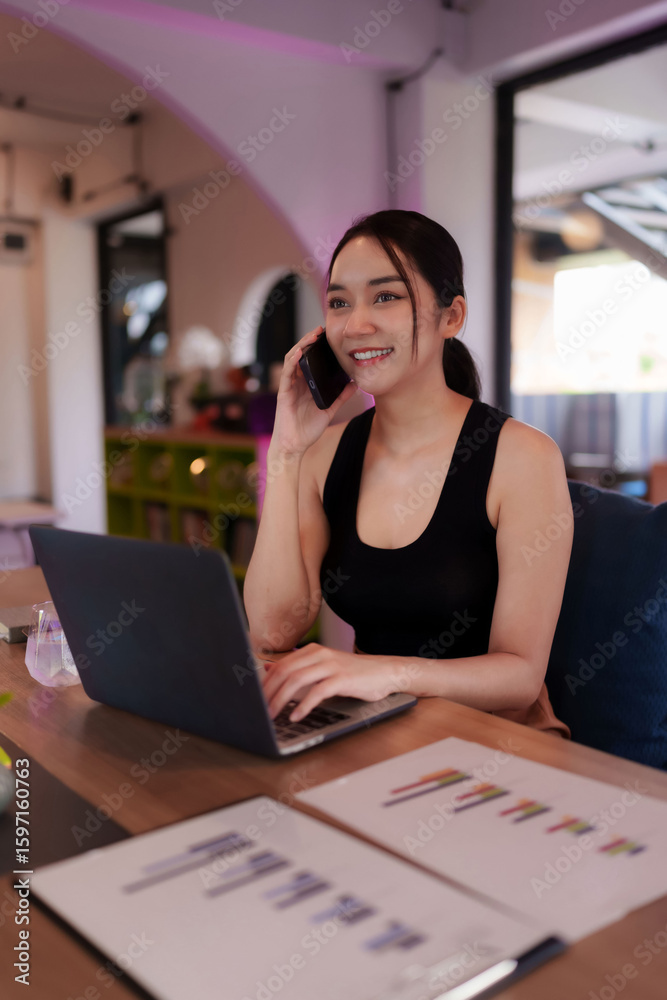Asian Adult Freelancer Digital Nomad Collaborating Online Using Laptop Smartphone Coworking Space