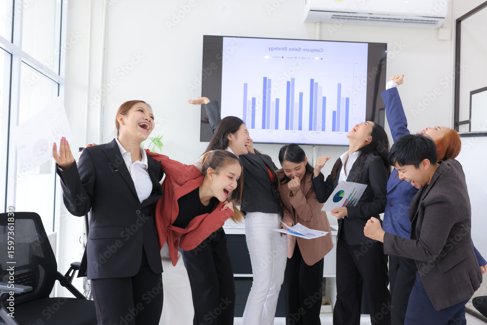 Happy Teamwork business people celebrate winning in a meeting room, happy employee group.