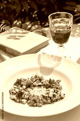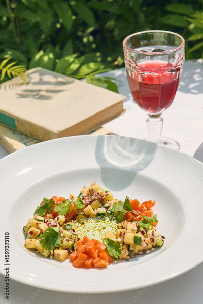 Salmon tartare and potato salad in bright outdoor light, overhead composition for summer terrace dining