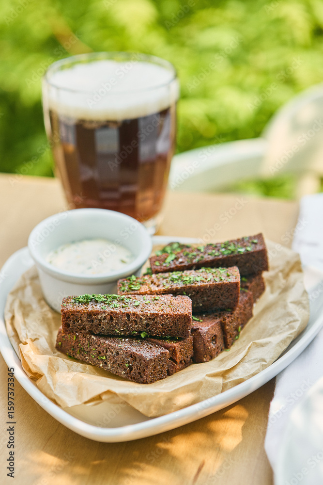 Borodinsky rye croutons with garlic, bright natural lighting, overhead table composition