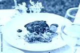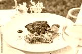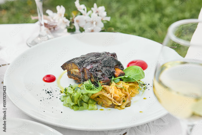 BBQ pork rib with braised cabbage and smashed cucumber, bright outdoor, overhead plate presentation
