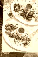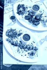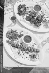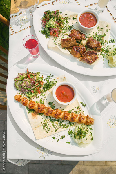 Chicken lula kebab and pork shashlik summer set, bright outdoor lighting, overhead composition