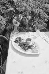 Pork shashlik platter with vegetable salad, bright outdoor lighting, overhead composition