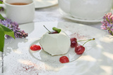 Creamy cherry mousse pastry in bright natural lighting, overhead composition on white plate