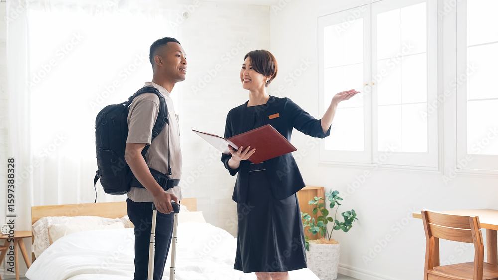 ホテル、外国人、女性、男性、旅行、チェックイン、インバウンド、接客、案内、ホテリエ、スタッフ、日本人、宿泊、説明、若い、黒人、アフリカ系、観光客、旅行者、観光、日本、民泊、ゲストハウス、リゾート、部屋、予約、宿泊客、リュックサック、スーツケース、リラックス、ホスピタリティ、清潔、明るい、快適、到着、笑顔、コンシェルジュ、ルームサービス、仕事、従業員、ガイド、室内、訪日、英会話、モダン、おもてなし、
