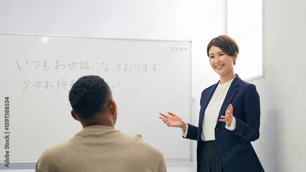 A female teacher teaches business terms to a black man at a Japanese language school.