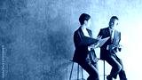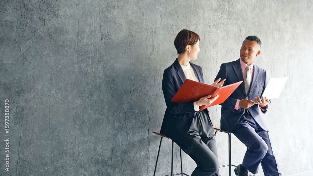 おしゃれな部屋で会話する黒人男性ビジネスマンと日本人女性スタッフ