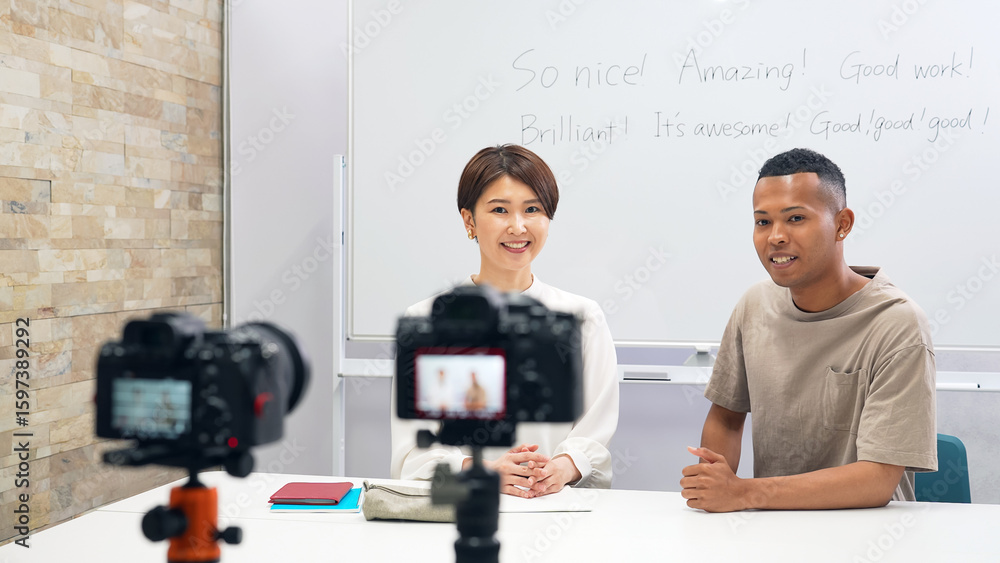 動画撮影する黒人男性と日本人女性