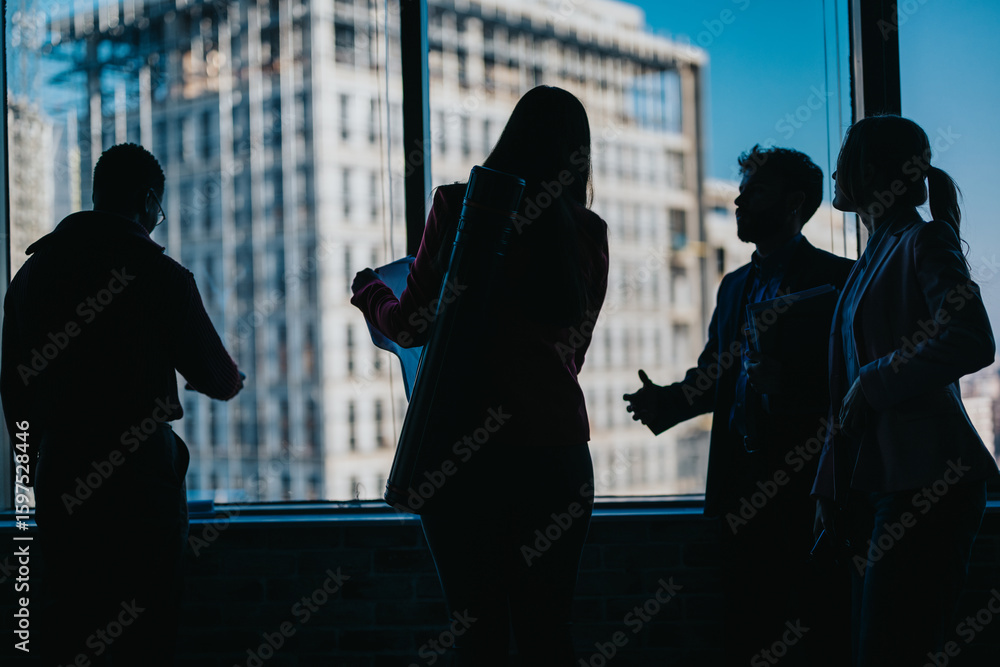 Silhouettes of a diverse group of professionals in a city building discussing aspects of construction or architecture while a bustling urban skyline provides an inspiring backdrop.