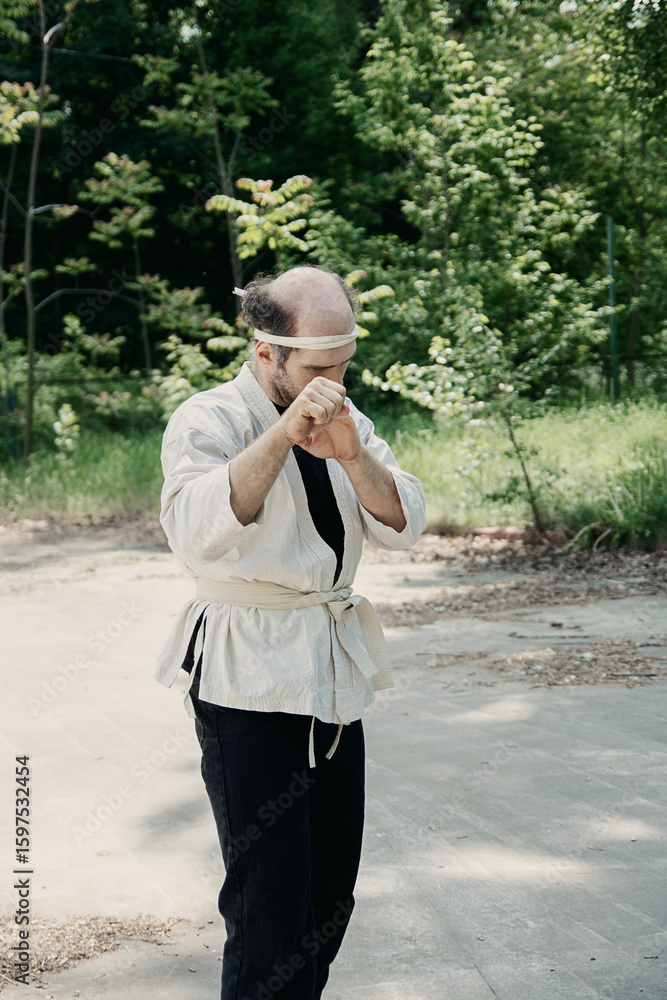 Bald man in martial arts gi with white headband stands outdoors in a defensive stance, fists raised, ready to fight or train.