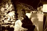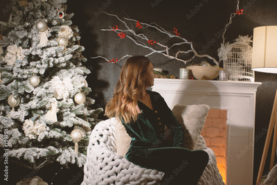 Woman in velvet sits by a snowy Christmas tree and fireplace, enjoying the cozy, elegant holiday ambiance. Perfect for festive themes and winter celebrations.