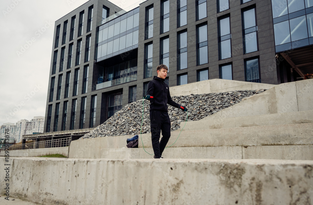 Young man in athletic wear holding a jump rope in an urban environment. A dynamic shot capturing a moment of street fitness and healthy lifestyle against modern architecture.