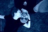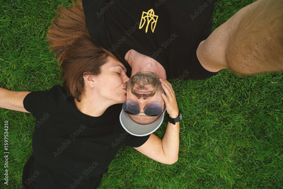 Lovely couple sharing a tender kiss while relaxing on vibrant green grass, captured from above. Features a Ukrainian trident on the man's shirt, symbolizing national pride and unity.