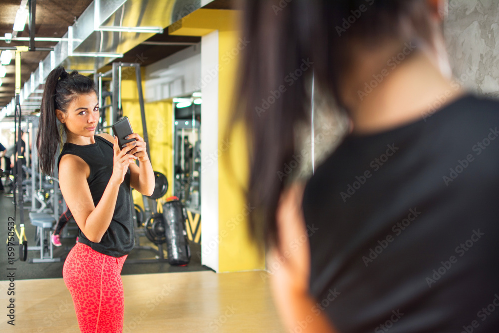 Sporty girl with smartphone taking mirror selfie in gym.