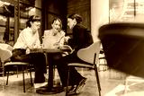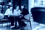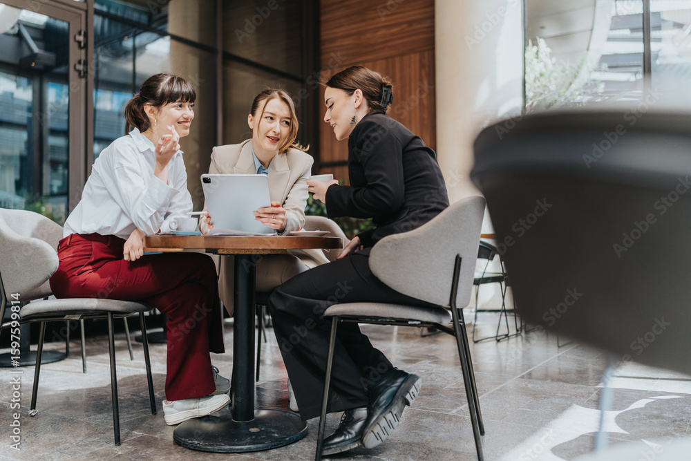 Three professionals exchanging ideas during a casual business meeting indoors.