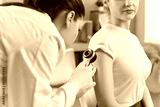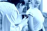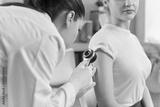 Patient arm skin and mole examination by dermatologist with dermatoscope in hospital. Doctor looking at skin of sitting young woman through magnifying glass. Cancer prevention, medical checkup concept