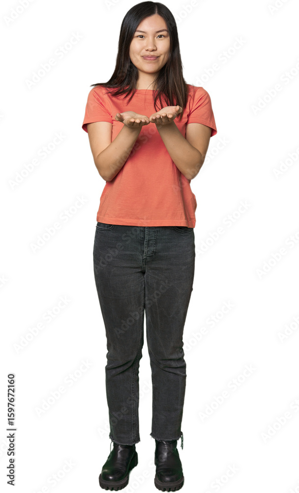 Full-body young Chinese woman holding something with palms, offering to camera.
