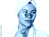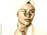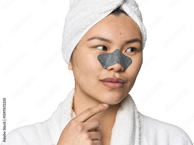Chinese woman in robe with pore strip on nose in studio