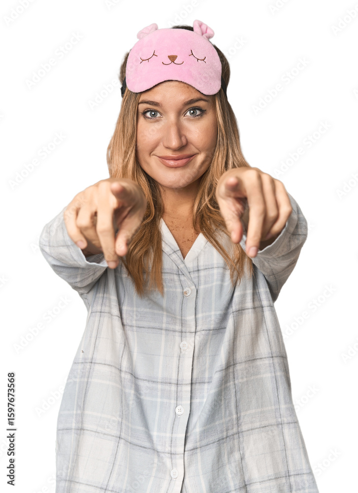Blonde in pajamas with sleep mask cheerful smiles pointing to front.