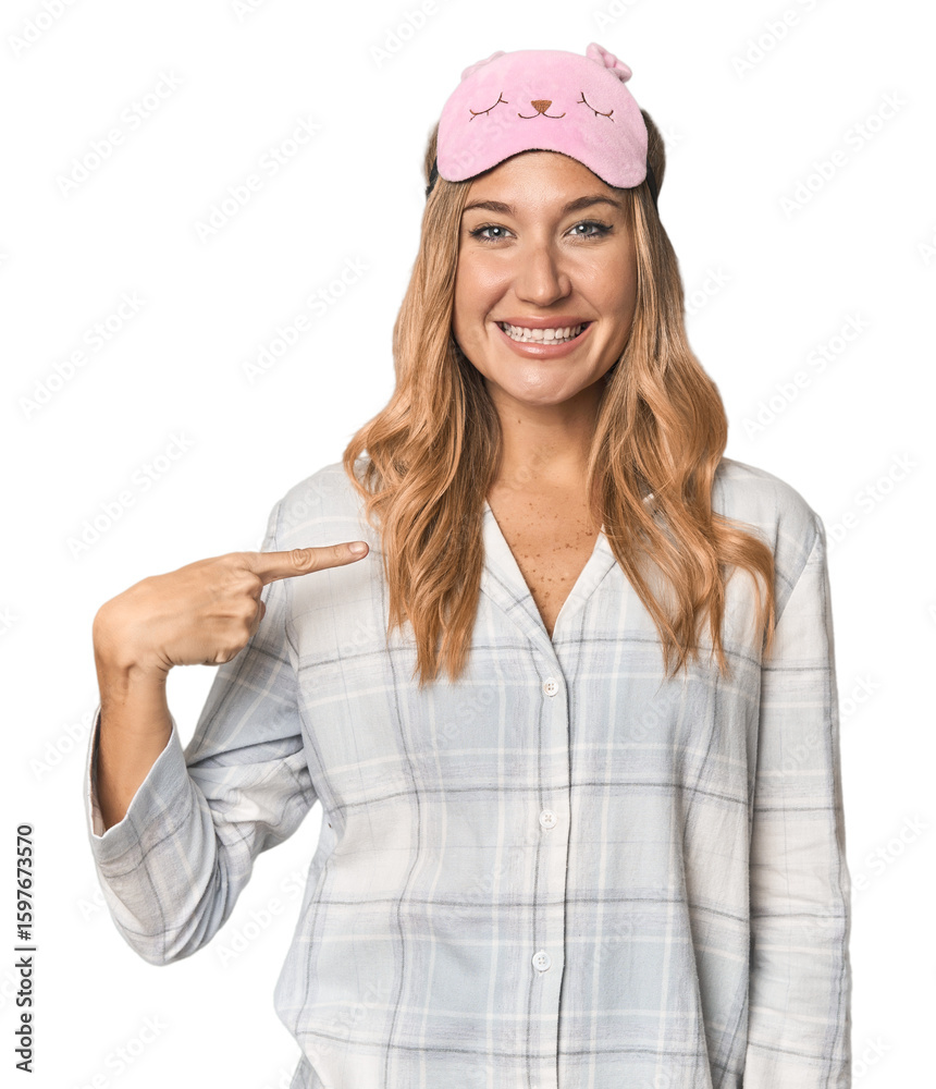 Blonde in pajamas with sleep mask person pointing by hand to a shirt copy space, proud and confident