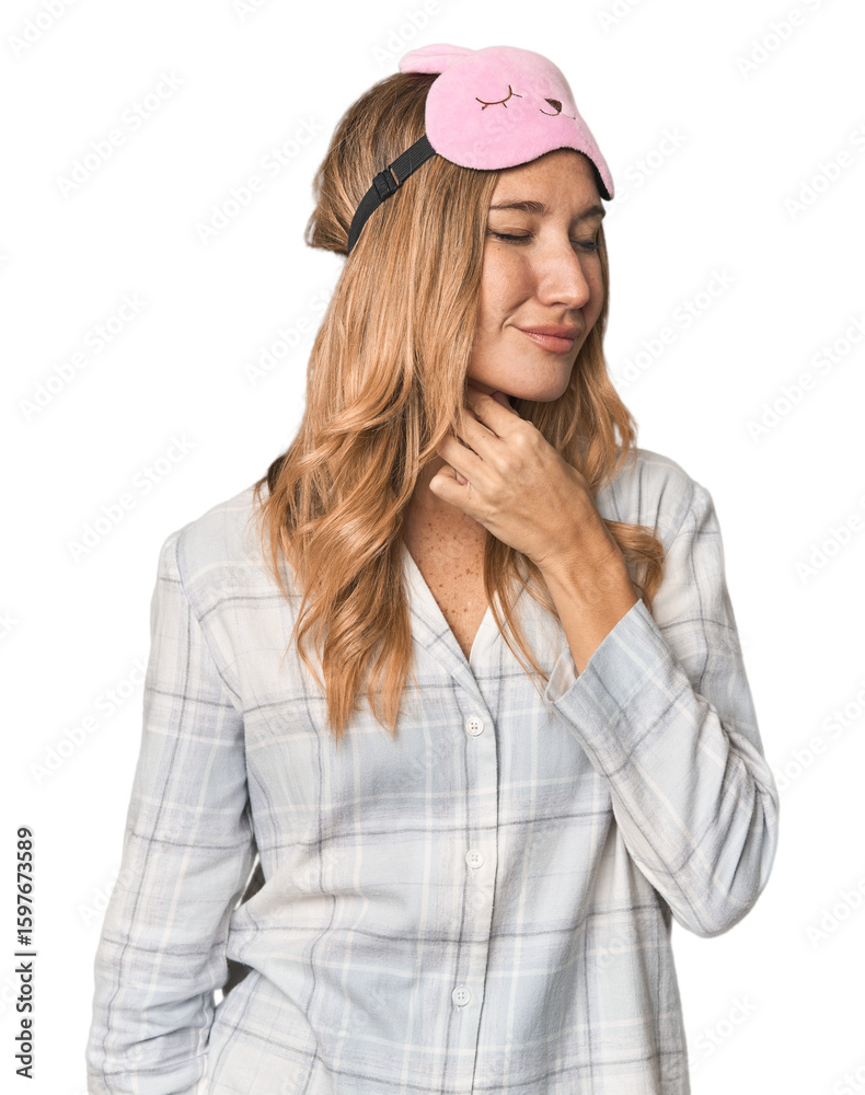 Blonde in pajamas with sleep mask suffers pain in throat due a virus or infection.