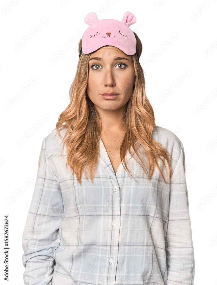 Blonde in pajamas with sleep mask sad, serious face, feeling miserable and displeased.