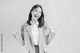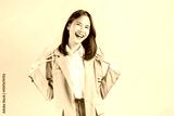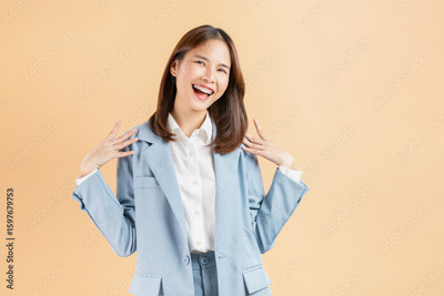 Happy Asian businesswoman stands with her hands raised, palms open, against a beige background.