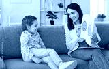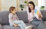 Psychologist and child test social skills, understanding language of emotions on meeting and therapy session in office. Young woman showing cards with sad and happy faces to kid. ADHD, autism concept