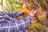 Young farmer inspecting, checking ripe corn cob in field, Dedicated farmer passionate about sustainable agriculture, Agronomist examining crop growth, Man nurturing fresh produce, harvesting season