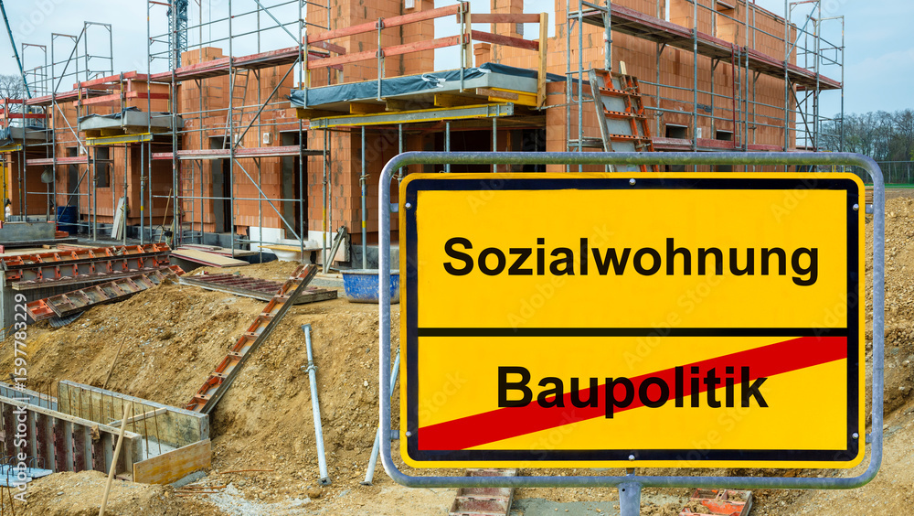 Ein Ortschild mit der Aufschrift Baupolitik und Sozialwohnung steht symbolisch vor einem Neubau einer Wohnanlage - FOTOMONTAGE