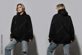 Confident Woman Wearing Oversized Black Hoodie with Blank Space for Mockup