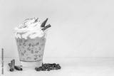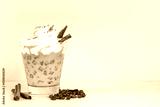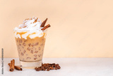 Iced cinnamon latte with whipped cream, cinnamon syrup and cinnamon powder on top, with coffee beans on white and beige background copy space