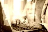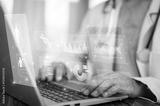 Doctor typing on laptop with virtual AI health interface, managing patient data securely and improving decision-making through automation
