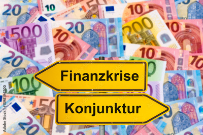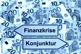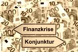 Vor vielen Euroscheinen steht symbolisch ein Wegweiser, der in unterschiedliche Richtungen zeigt und beschriftet ist mit Finanzkrise und Konjunktur - FOTOMONTAGE