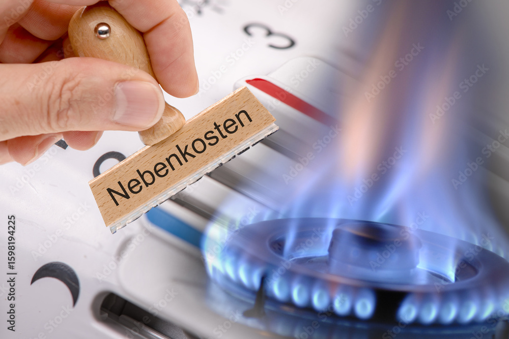 Ein Holzstempel mit Aufdruck Nebenkosten wird vor eine Gasflamme und einem Thermostat für die Heizung gehalten - FOTOMONTAGE