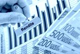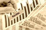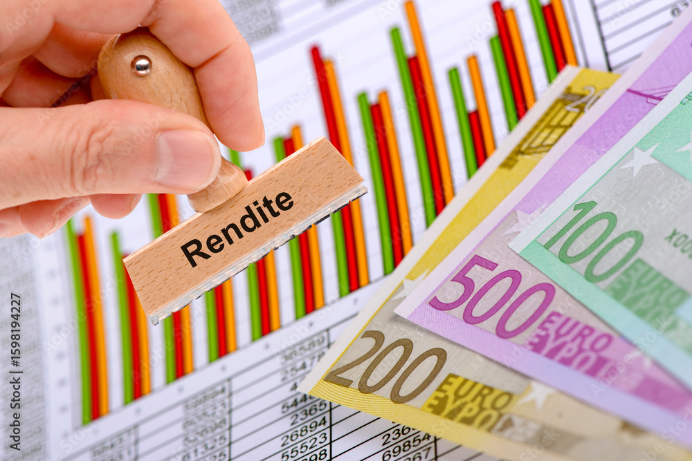 Ein Holzstempel mit dem Aufdruck Rendite wird vor einen Chart mit vielen Euro Banknoten gehalten - FOTOMONTAGE