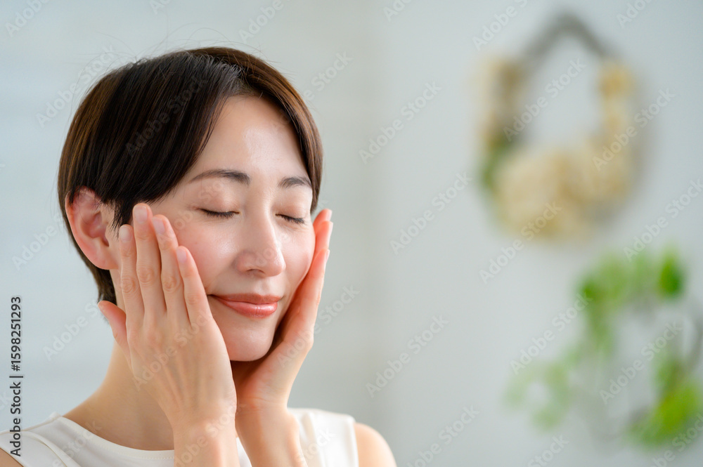 ノースリーブで明るい部屋にいる日本人女性のビューティーイメージ