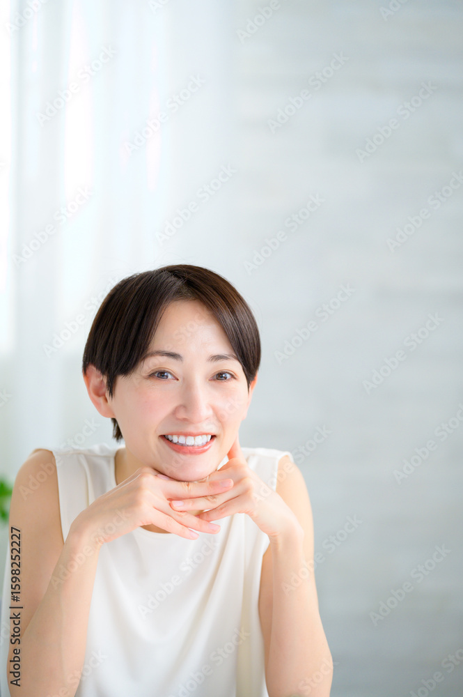 ノースリーブで明るい部屋にいる日本人女性のビューティーイメージ