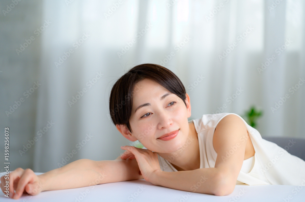 ノースリーブで明るい部屋にいる日本人女性のビューティーイメージ